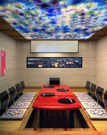 Aulac's upcoming Japanese restaurant, an extension of the globally renowned vegetarian brand, embodies luxury. VIP rooms showcase a breathtaking Murano glass flower ceiling, and low seating in the Japanese tradition. The inner garden enhances the clair-obscure ambiance. We designed tatami mats and carved stone walls, suspended from the ceiling, making this space truly unique.